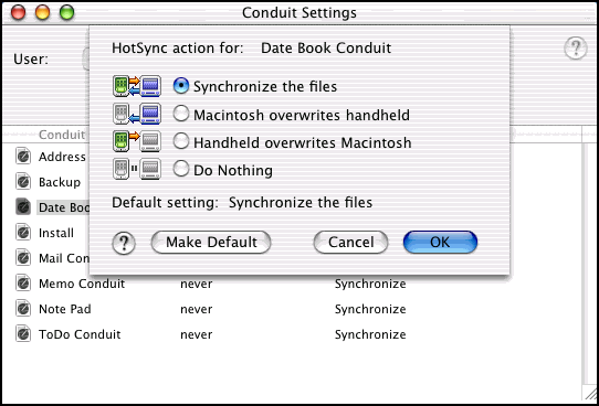 HotSyncマネージャから、WindowsMac OS、およびMac OS X用にコンジット設定をカスタマイズすることができます。設定をカスタマイズしない場合、デフォルトは[Synchronize the files]になります。