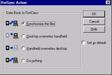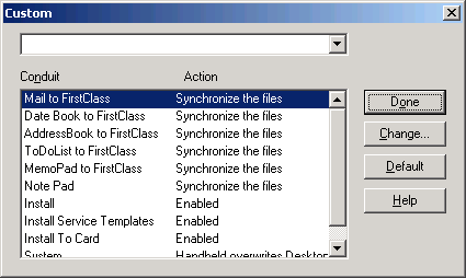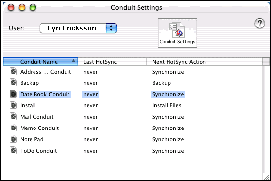 HotSyncマネージャから、Windows、Mac OS、およびMac OS X用にコンジット設定をカスタマイズすることができます。設定をカスタマイズしない場合、デフォルトは[Synchronize the files]になります。