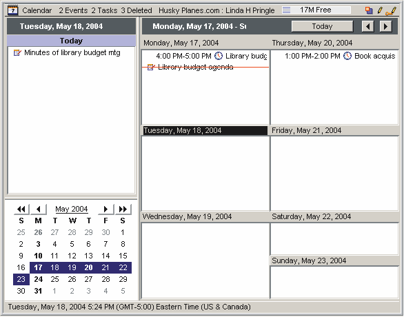 アクティブなペインのカレンダーを月表示、週表示、または日表示にするには、ツールバーの該当するボタンをクリックしてください。日表示では、時間帯も含めた最も詳細な情報が表示されます。作業および終日の予定は、この表示の上部に表示されます。