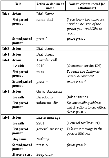Once you have completely set up your voice menu and it is activated and working, you should keep a record of all settings for future reference. You may find it helpful to create a chart something like the following: