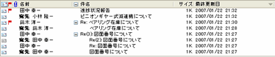この例では、グループ化されていることを表す列が[件名]列の左側に表示されます。グループ化を表す列には、ツリー表示ボタン(Windows、Linux)または三角形の展開ボタン(Mac)が、グループ化されたアイテムの横に表示されます。