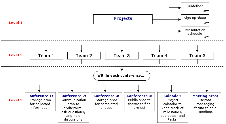 Within the main conference called Projects, there are three documents that outline the project guidelines, the teams and their projects, and the presentation schedule. Within the Projects conference the teacher creates a conference for each team based on their project name. Within each of those conferences the students can create their own subconferences that meet the criteria laid out in this chart.