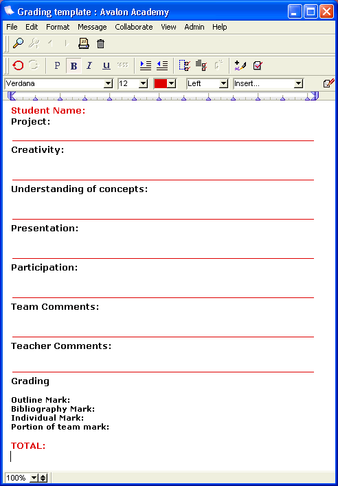 Furthermore, you can create a grading template online that you give back to students. It can contain a list of criteria you are using to grade the projects. You can complete it and email it to each student's Mailbox. You can provide fields for originality, creativity, and don't forget room for comments.