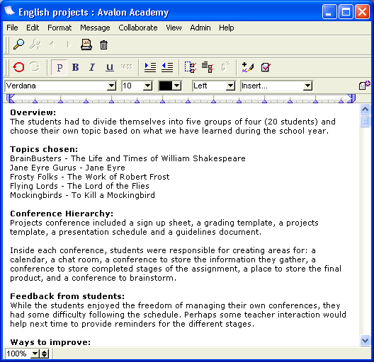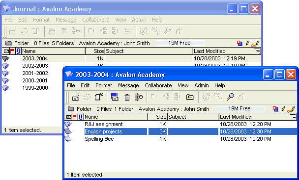 Do you maintain hard copy files from year to year to remind you of what projects you have done and how they turned out? Consider using FirstClass documents to maintain a journal from one year to the next. Record session notes, problems encountered, how to handle obstacles, new ideas, best practices, and so on.