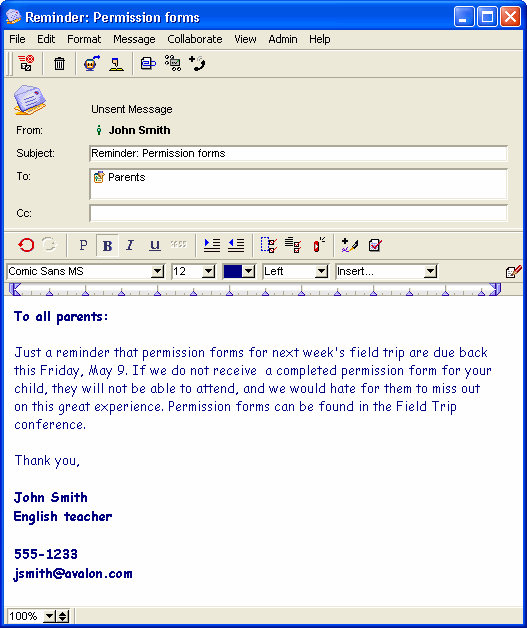 Although the information is posted for all to see, John wants to make sure parents haven't forgotten to check the conference. He has a mailing list called Parents where he has all of the parents' home and work email addresses. A couple days before permission forms are due, he sends out an email reminder to this mailing list.