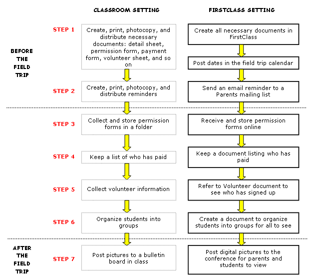 This chart shows how you can manage all of the details of a field trip in FirstClass, just as you would in a traditional setting.