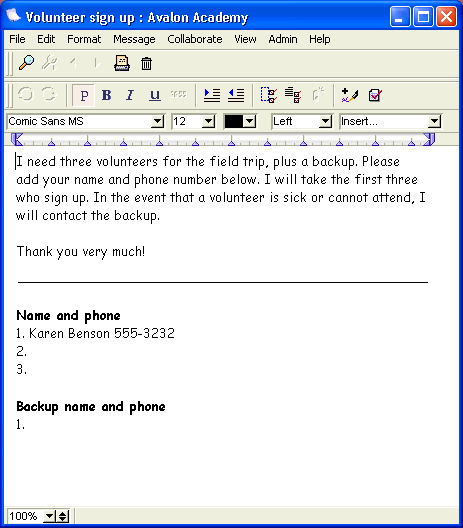 John requires three volunteers for the field trip. He creates a document inside the Field Trip conference where parents can sign their names. The first three parents to sign up get to go on the trip.