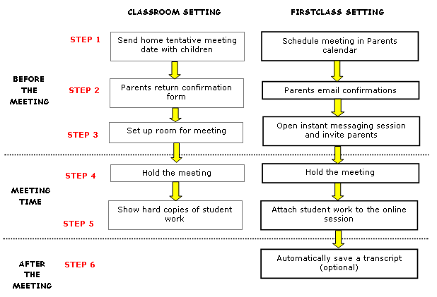 This is a flowchart that shows the traditional method of holding a parent-teacher meeting versus the FirstClass method.