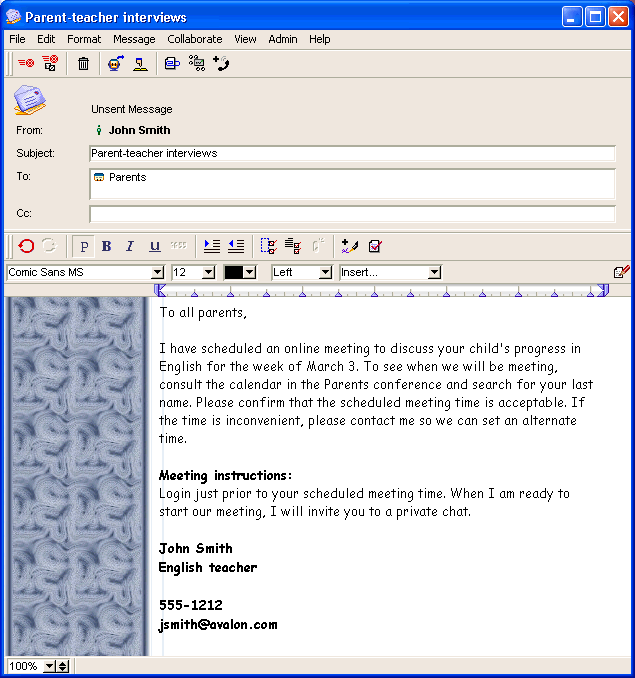 John Smith teaches Grade 12 English at Avalon Academy. He arranges an instant messaging session with each set of parents at least once a term. His parent environment contains a calendar where he books all of the meetings.