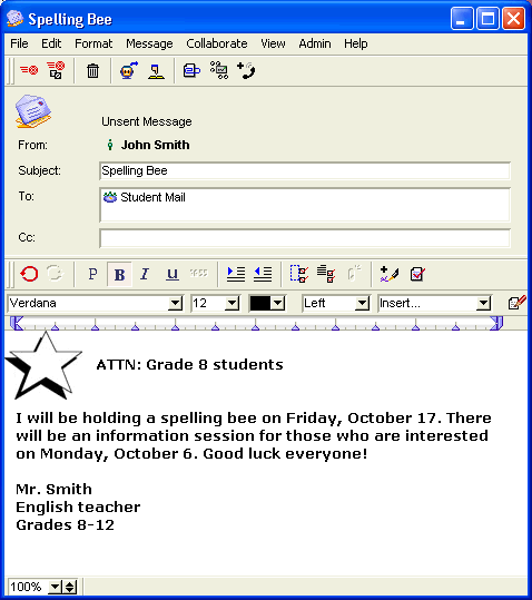 John Smith is a teacher at Avalon Academy. He likes to add images to his emails to make them more interesting to his students. To add a background, John does the following: