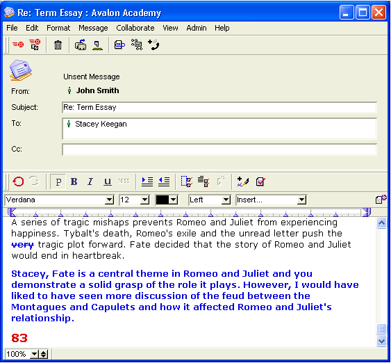 John doesn't need to carry a stack of essays home to grade. Whether he is at home or at school, he can log in and grade essays. He grades them by creating a reply message addressed to the student and adding comments in blue using Verdana Bold 10. He includes his assessment and grade at the end of the essay.