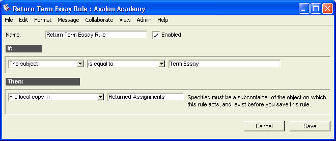 This is the mail rule John set up to handle returned essays.