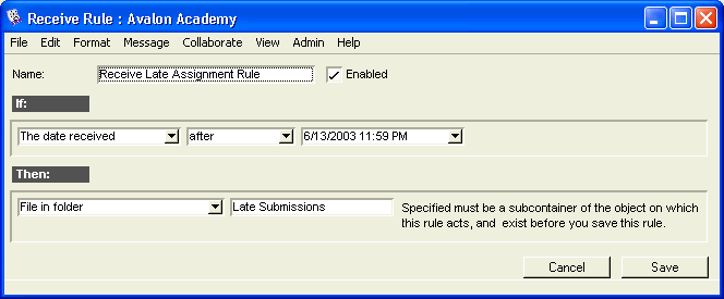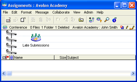 John Smith teaches Grade 12 English at Avalon Academy. He requires each student to write one essay per term. Students send their essays to an Assignments conference. Late assignments are subject to a penalty, so John created a mail rule to file any essays arriving after the due date in a Late Submissions subconference.