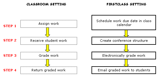 Here is a comparison of the conventional way to grade student assignments versus how you would do it in FirstClass.