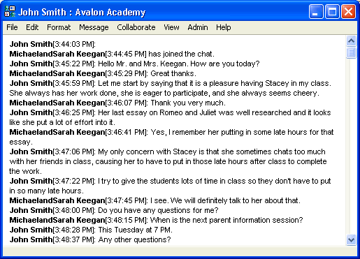 John schedules several parent meetings in succession. He starts each instant messaging session by selecting Private Chat from the Collaborate menu and inviting the respective parent.