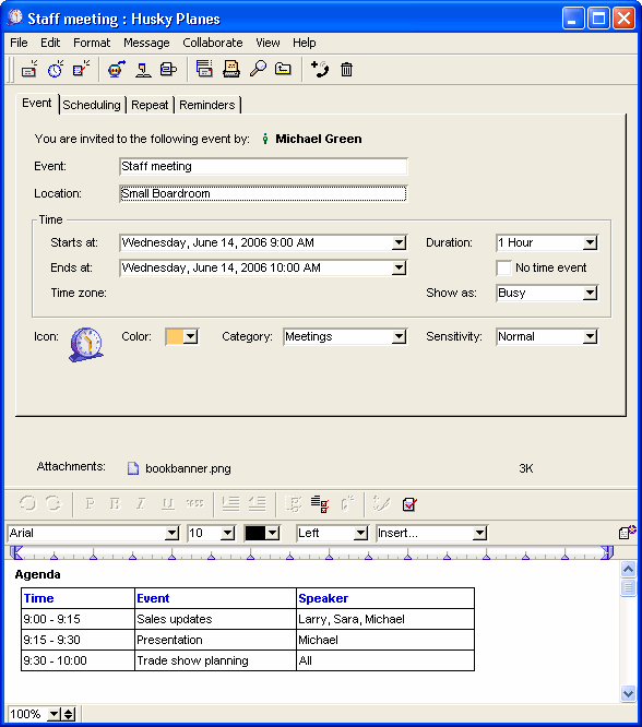 This is what the event looks like when he schedules it. Notice the agenda he entered as a table and the attachment at the bottom of the event.