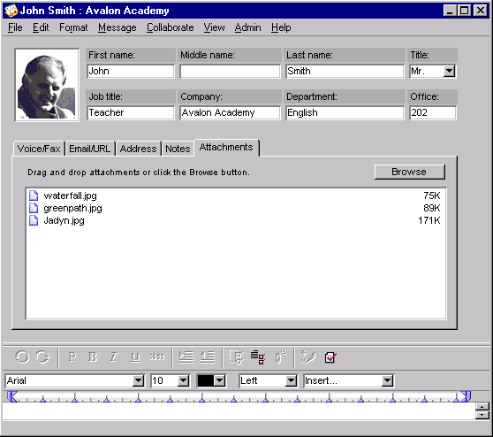 Madelyn adds links to some of her contacts' web pages on their personal address forms. Also, she has some pictures on file that were taken on a recent field trip, so she attaches them to the personal address form of that teacher.