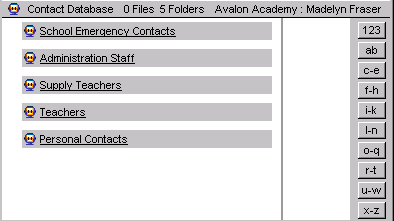 Madelyn creates contact databases within her Contacts folder for personal contacts, teachers, supply teachers, school administration, and emergency numbers.