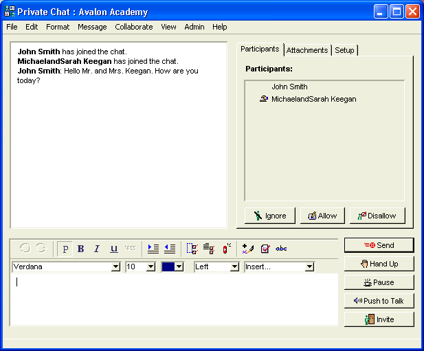 This is a chat room session John is using for a parent-teacher interview.
