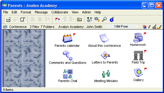 John Smith is a teacher at Avalon Academy. He wants to maintain open communication with parents, so he creates a Parents conference in his class conference, and then subscribes parents so the conference appears on their Desktops.