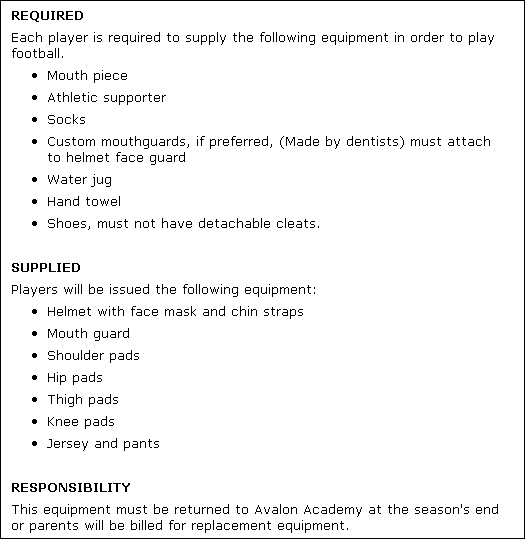 a document listing equipment requirements for the players