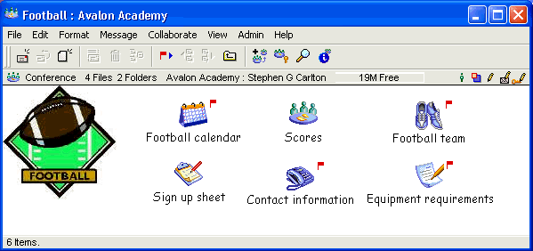 Want to manage your sports team easily and minimize the paperwork? Use a FirstClass conference. Create documents listing team members, scores, equipment requirements, signup sheets, contact information, and so on. Use a FirstClass calendar to post games and practices.