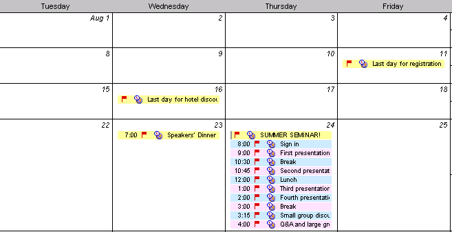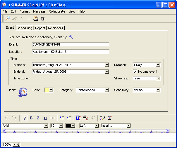 Michael uses the FirstClass calendar in the Summer Seminar conference to advertise the date of the seminar. At the same time, he books the location and any required resources.