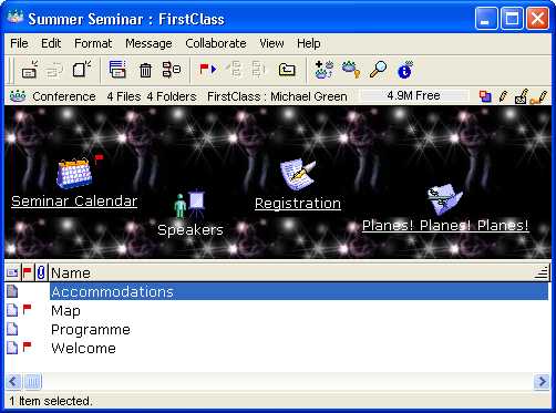 Using FirstClass, Michael can advertise the seminar to his customers in any of his public conferences. To generate interest for potential customers, some of the conferences are also visible over the web.