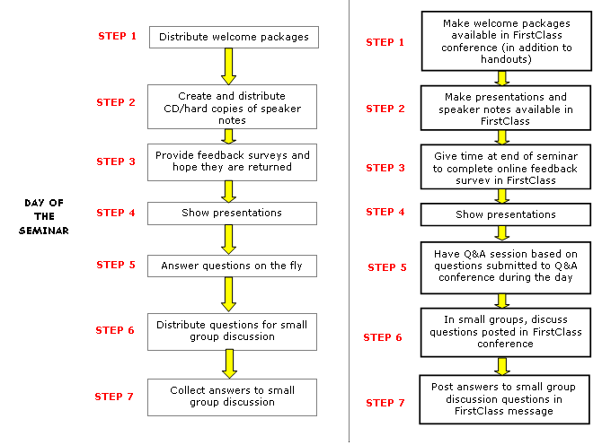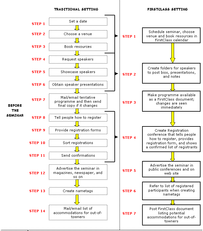Take a look at how you would traditionally organize a seminar and how you could do it in FirstClass.