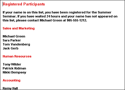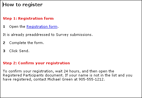 If Michael wishes, in addition to a Registered Participants document, he could use a mail rule to automatically generate an email message to let the participant know that their registration has been received and will be confirmed within 24 hours.