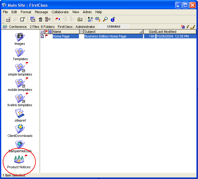 FirstClass web sites are located in the WWW conference in the Internet Services folder on the administrator's Desktop.