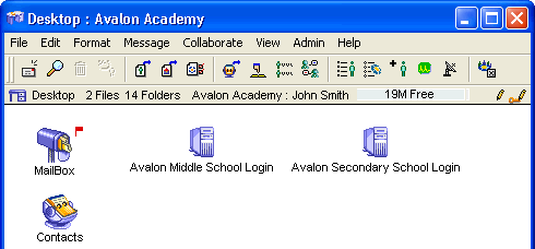 In addition to being an English teacher at Avalon Academy, John Smith is also the FirstClass administrator at the Avalon school board. He is responsible for maintaining the servers at the various schools in the Avalon district. He logs into these accounts daily using bookmarks he created on his FirstClass Desktop.