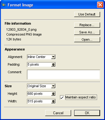 If John wants to format an image he pasted into a message or document, he simply selects the image and chooses Format > Format Image. From the Format Image window, he can customize the alignment, padding, size, height, and width of the image: