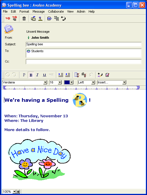 John Smith teaches English at Avalon Academy for grades 7 through 12. He likes to lighten things up by adding backgrounds and images to his class conferences. He also enjoys using funny images in the messages he sends his students.