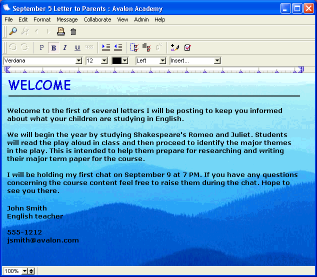 John decides that he also wants to add a background image to a welcome document he plans to make available to parents in the Parents conference.