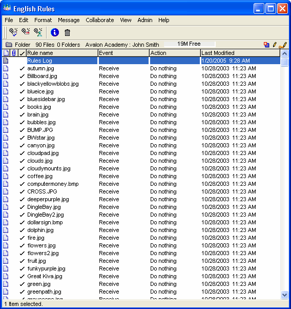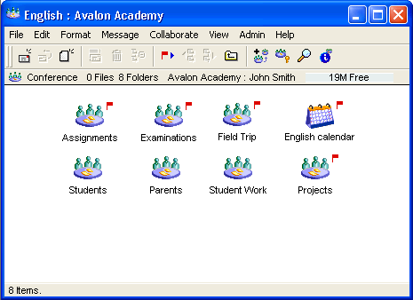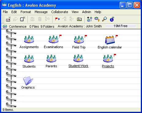 John collects all of his favorite graphics and stores them in the Rules & Resources folder of his English conference so he can find them easily. He accesses this folder by opening or highlighting his English conference, and then choosing Collaborate > Rules from the menu.