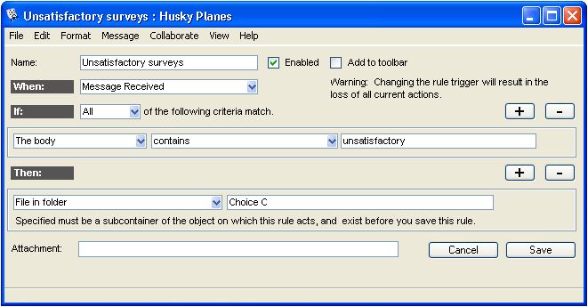 This is where replies are sorted that require immediate attention. He creates a mail rule in the Survey Submissions subconference to handle the replies. The mail rule looks for the phrase "Unsatisfactory" in the survey and files them in this folder for special attention.