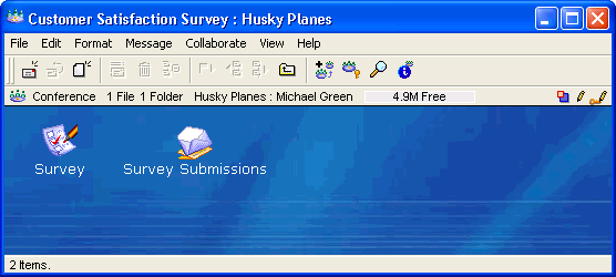 Want an easy way to plan, distribute, and collect surveys? Use FirstClass to manage all the details. Use a FirstClass document to create and edit the survey, the Contacts folder to compile a list of contacts and create a mail list, and a mail rule to collect and sort the surveys.