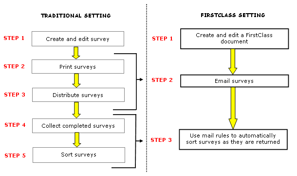This flowchart shows the traditional way you would manage a survey, and how you can do it in FirstClass.