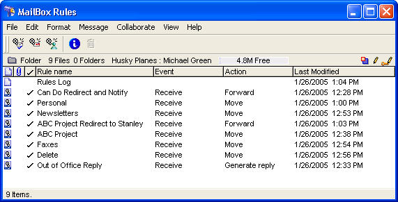 Once Michael has created all of the rules, he needs to put them in order to ensure that messages are handled properly. This is what the rules list looked like before Michael added the new rules.