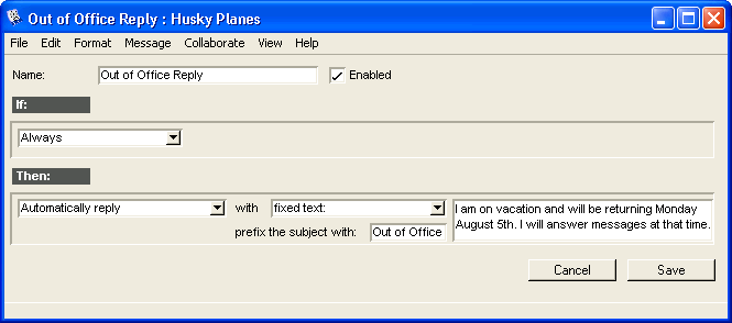 Want to make sure important messages are handled without interrupting your vacation? Or maybe you only want to handle mail relating to a large deal that is in negotiation. Use mail rules to redirect business messages to fellow employees and generate an autoreply to personal messages. Use the same set of rules to forward especially important messages to your home account and send a notification to your pager.