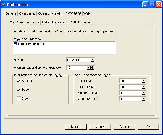 Michael uses the Messaging > Paging tab of the Preferences form to configure his pager in advance. He includes his pager email address, information to include when paging, and items to forward to the pager.