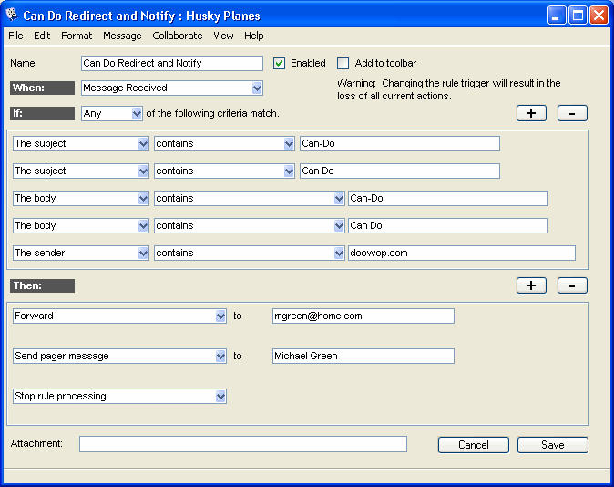 The next rule forwards all messages related to the Can Do project to Michael's personal account that he checks while on vacation, and then stops rule processing. He also sets up the rule to notify his pager if any of these messages are received.