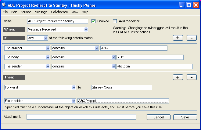 The first rule redirects all mail relating to the ABC project to Stanley Cross, and files a copy in the ABC Project folder.