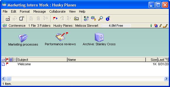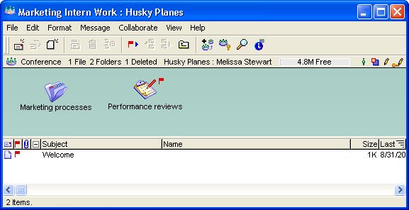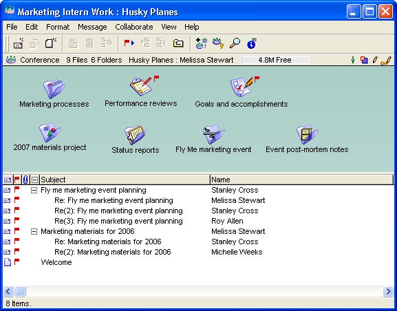 Melissa Stewart is a Marketing Manager at Husky Planes. Her new intern, Stanley Cross, is responsible for helping the team coordinate events and create marketing materials. To make sure Stanley has all the information he needs to learn about the work and to track his progress, Melissa creates a new conference on her FirstClass Desktop called Marketing Intern Work and adds the following containers to the conference: