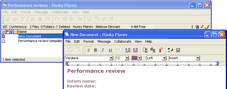 Melissa creates a stationery document in the Performance reviews conference to periodically post reviews of Stanley's work.