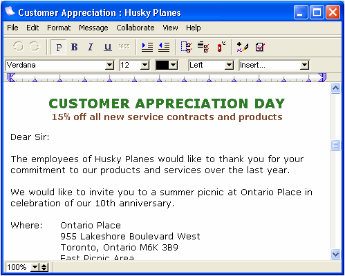 Michael Green is the VP of Sales and Marketing at Husky Planes. He wants to send a letter to current customers about an upcoming promotion. He creates the letter in a FirstClass document, using Husky Planes' corporate colors for his headings.