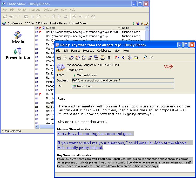 While FirstClass allows you to schedule and coordinate these meetings, it also provides a means of conducting online meetings. Team members can get together at their own computers at the scheduled time to participate, regardless of their location. This makes it easier for project teams to hold meetings, especially when distance, weather, or illness is an issue.