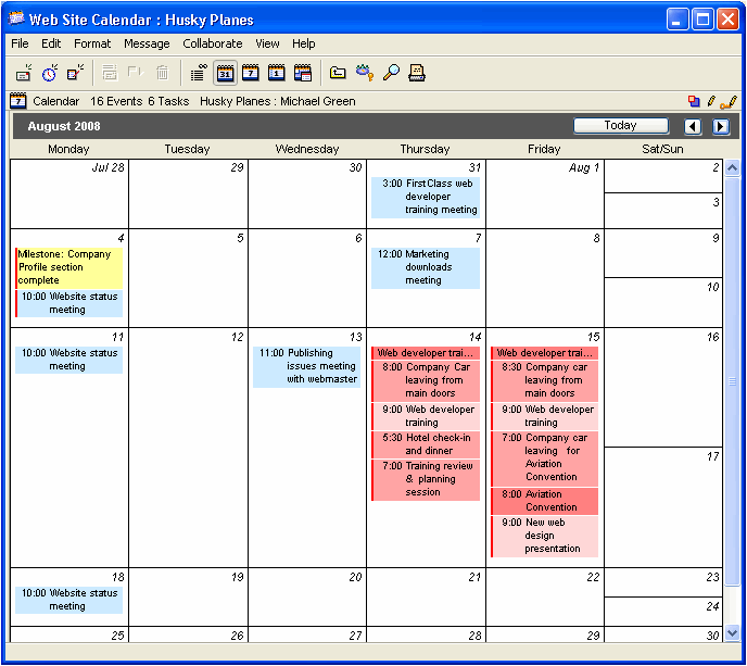 He can also differentiate events with color. For example, he may use one color to schedule meetings, and another to schedule milestones.