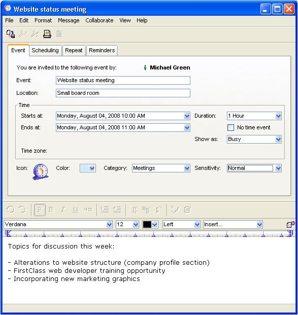 When he schedules the meeting, he can request responses from team members to ensure they know about the meeting, schedule repeating events, such as a meeting every Friday at 1 PM, schedule reminders, and even attach messages or documents that team members may need to review before the meeting.